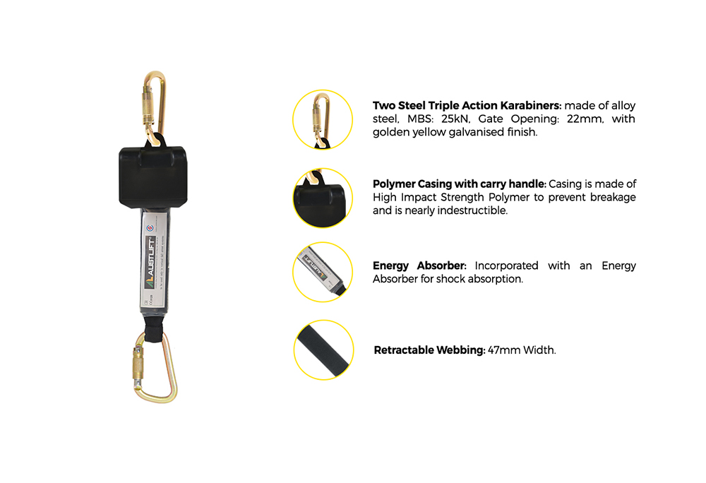 • Retractable Webbing: Made of 47mm or 25mm durable webbing, extending up to 2.5m or 3.5m depending on the model.