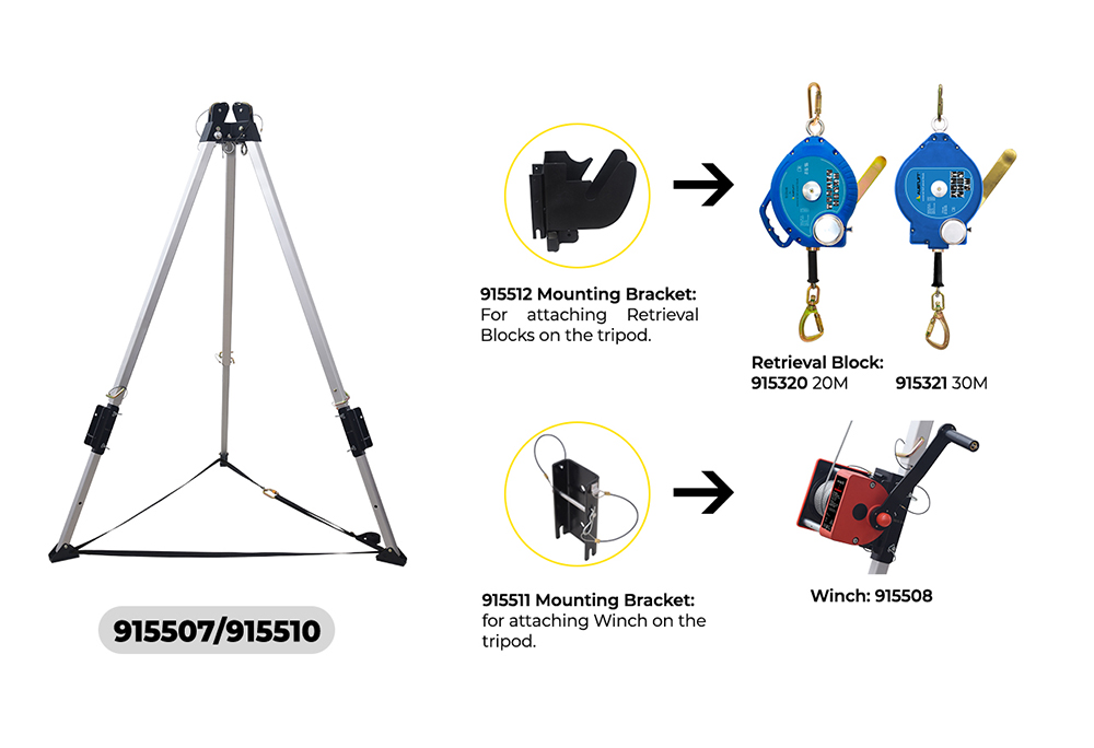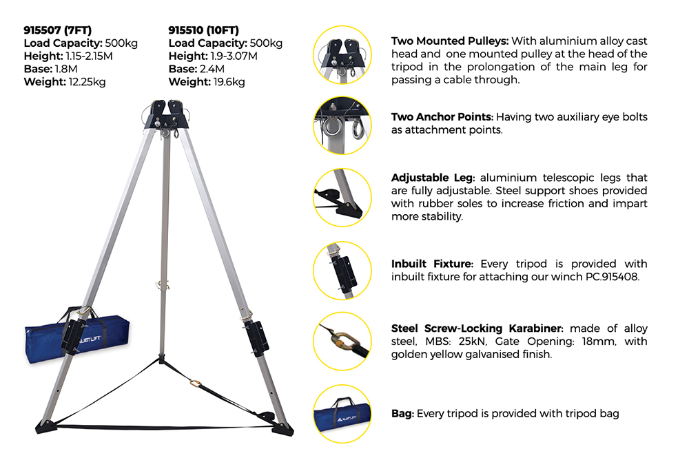 • Dual Mounted Pulleys: Includes one mounted pulley at the tripod head and an additional pulley aligned with the main leg for efficient cable management.
